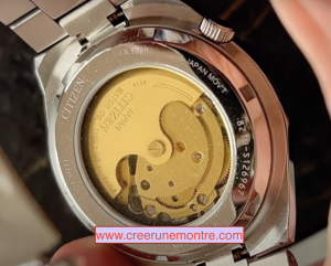 Le boîtier de la montre Citizen Tsuyosa dispose d’un couvercle ouvert pour voir son mouvement. C’est un mouvement automatique Japonais finition gold très beau. La masse oscillante est très réactive et elle est gravée.